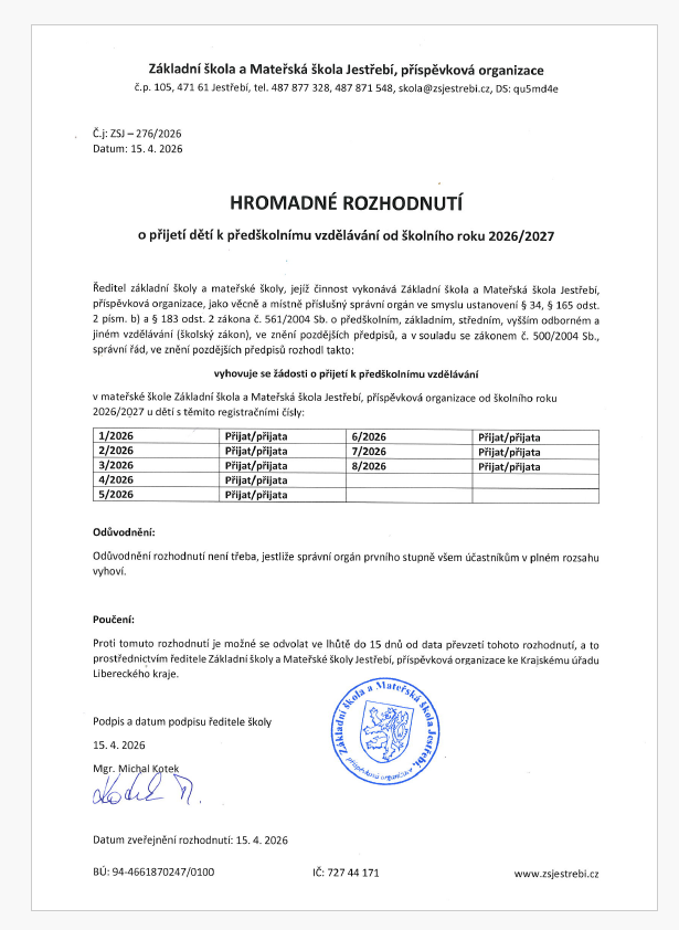 Hromadné rozhodnutí o přijetí k předškolnímu vzdělávání na školní rok 2026/2027